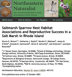 A report of SSRI research findings has been published as a special issue of the Rhode Island Naturalist. The paper is titled: Relationships of Nest-Site Selection and Nest Success of Saltmarsh Sparrows (Ammospiza caudacuta) in Upper Narragansett Bay, Rhode Island.